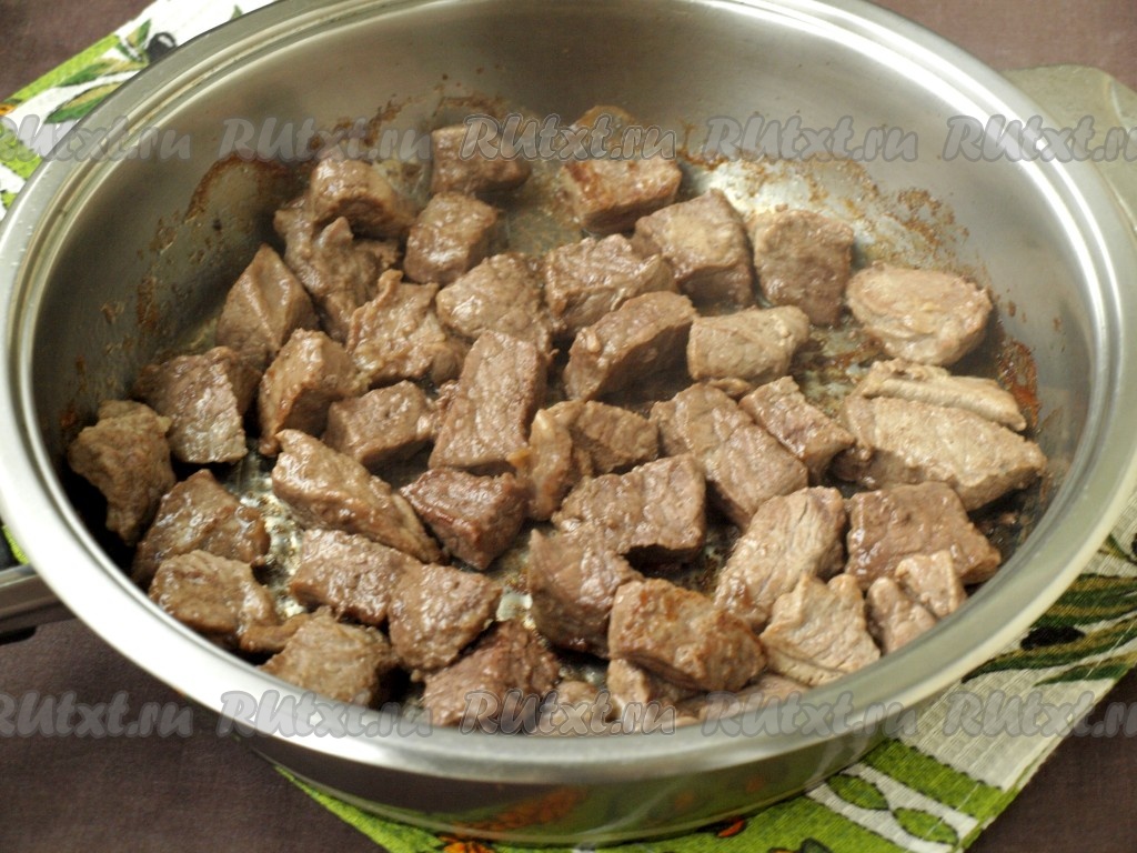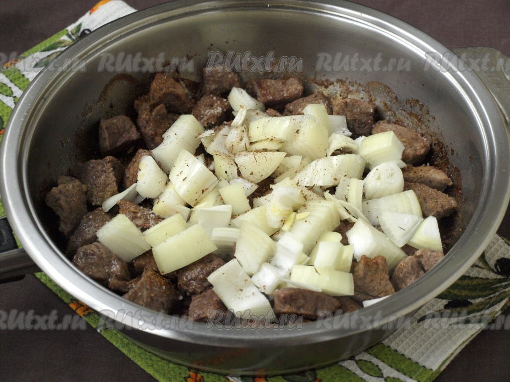 Добавить в сковороду нарезанный кубиками очищенный лук, обжарить до прозрачности, не забывая иногда помешивать. Затем в сковороду влить воду (вода должна почти полностью покрывать говядину), посолить и поперчить. Накрыть сковороду крышкой, убавить огонь и готовить 40 минут. Периодически проверяйте, чтобы не выкипела вся вода.