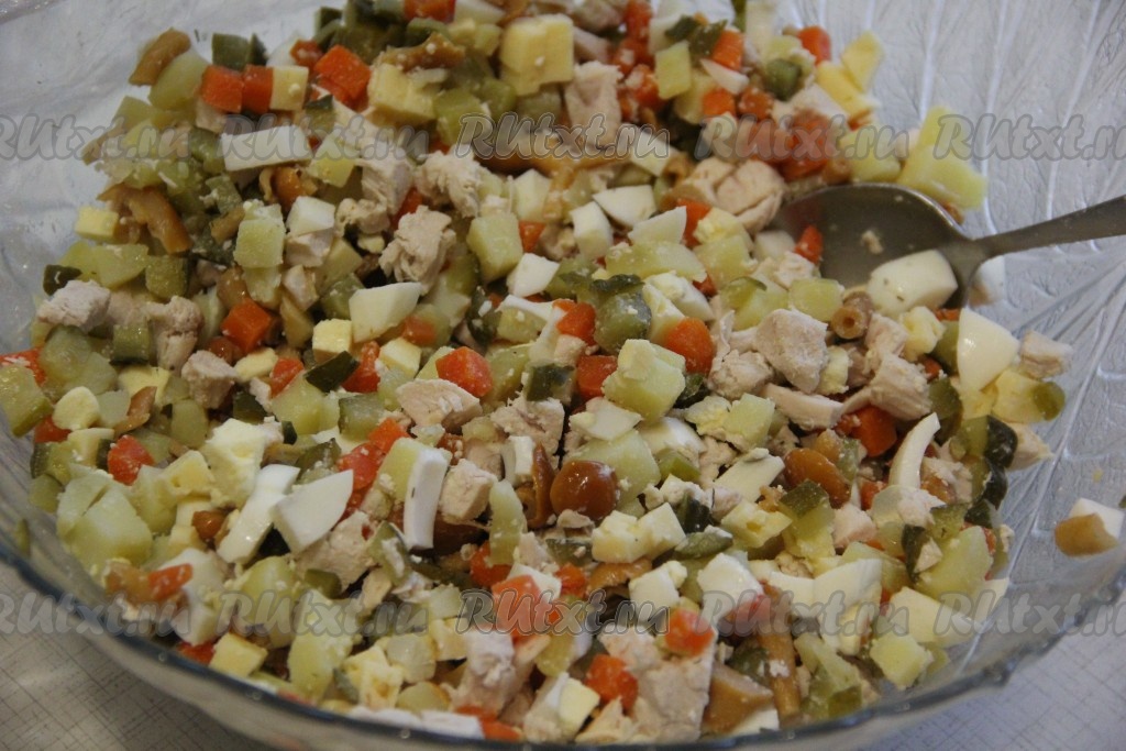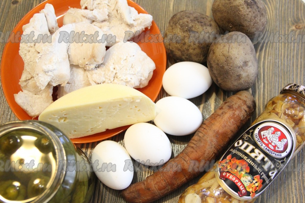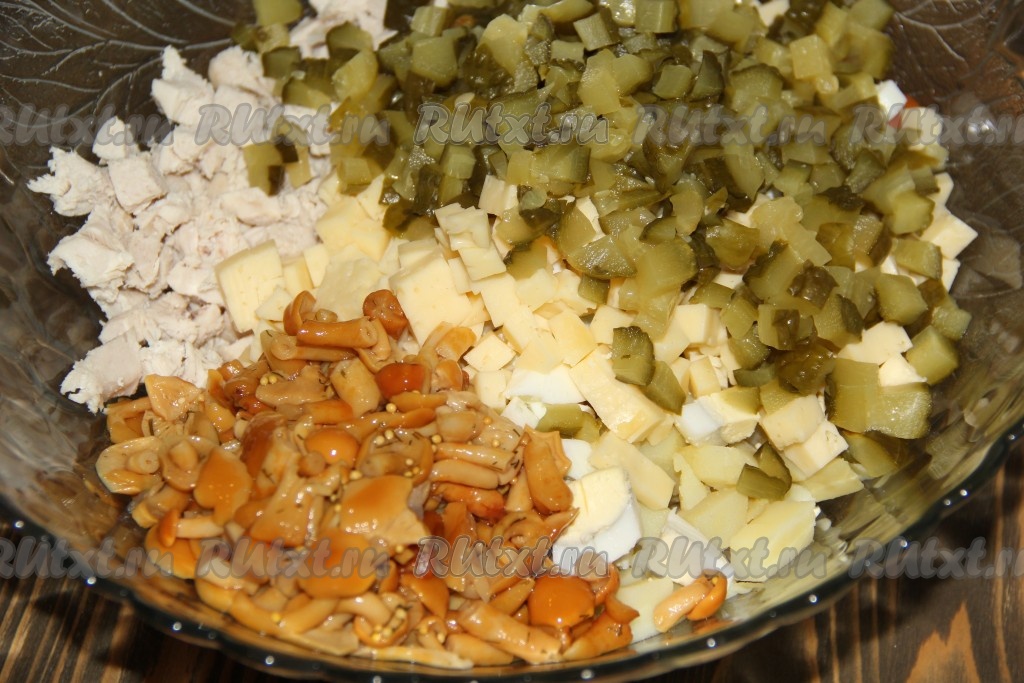Добавить маринованные опята, сыр и огурцы в салат из куриной грудки, картошки, яиц и моркови.