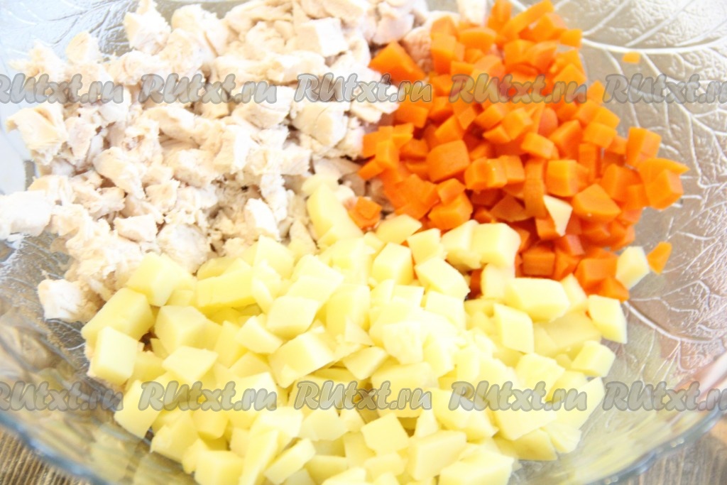 Подготовить продукты. Куриную грудку отварить до готовности (в течение 20-25 минут) и остудить. Морковь, картофель и яйца сварить, остудить и очистить.