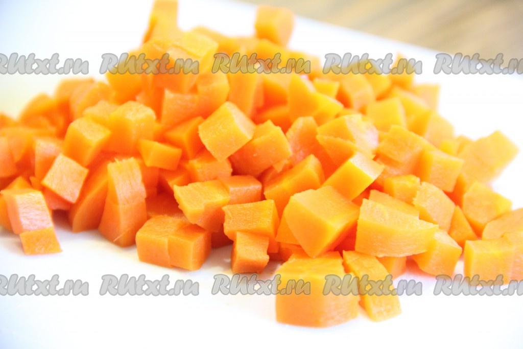 Морковь тоже нарезать средними кубиками.