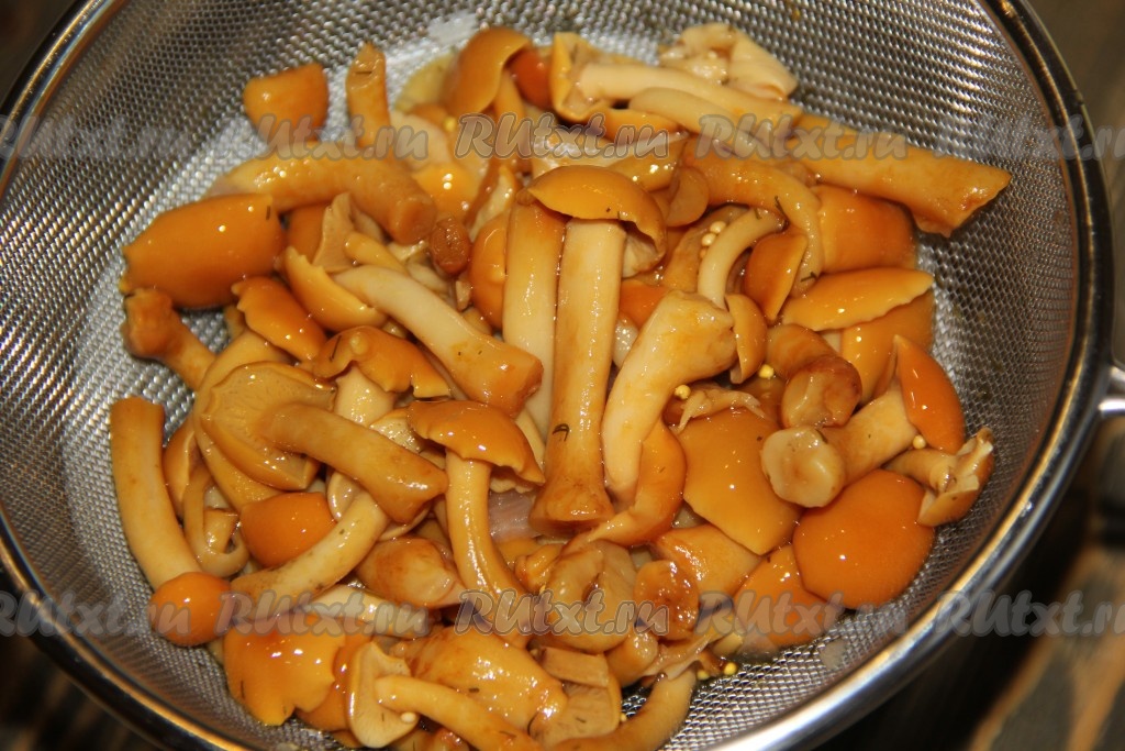 Маринованные опята откинуть на дуршлаг и дать стечь жидкости.