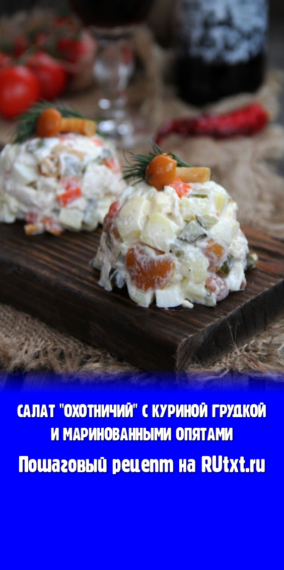 Салат "Охотничий" с куриной грудкой и маринованными опятами заправить майонезом непосредственно перед подачей. Можно подать в салатнике или порционно в пиалках. Сытно и очень вкусно, попробуйте!