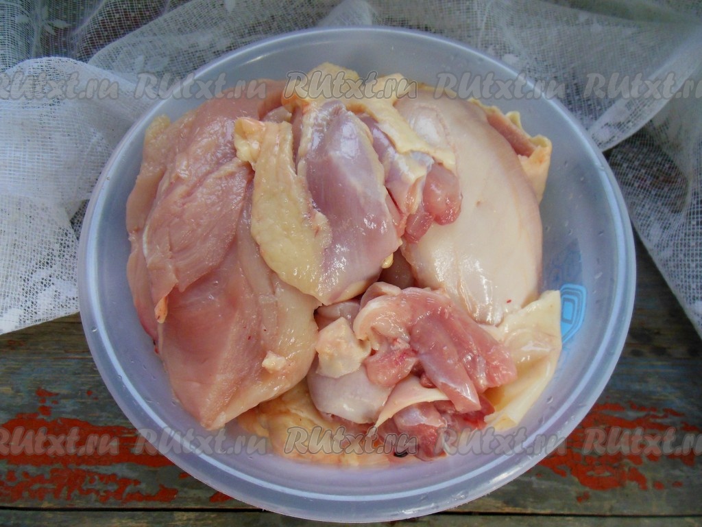 Разрежьте курицу на кусочки, отделите мясо со шкурой от костей. Кости пригодятся для приготовления первых блюд.