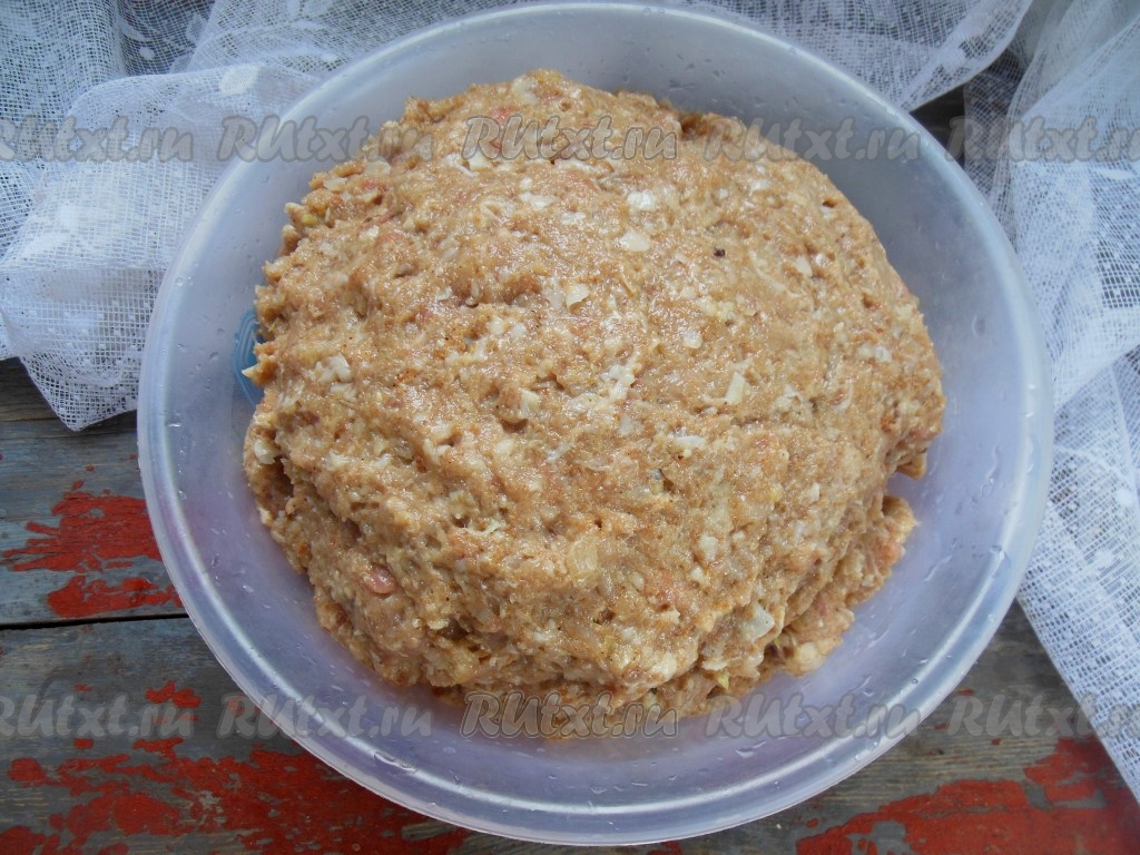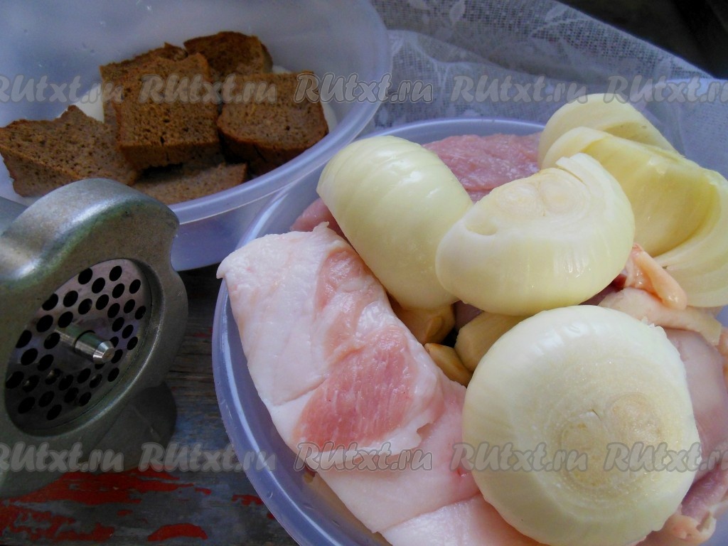 Пропустите через мясорубку куриное мясо вместе со шкурой, очищенные репчатый лук и чеснок, сало без шкуры и отжатый от молока хлеб (оставшееся молоко не выливайте, оно еще пригодится).
