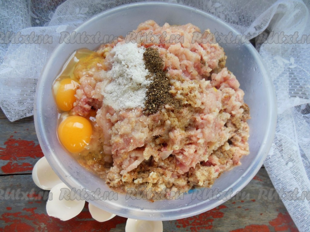 В фарш добавьте соль, черный молотый перец, куриные яйца.
