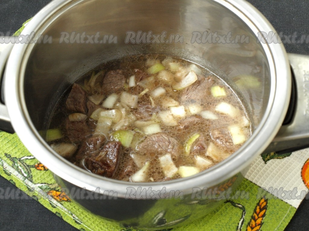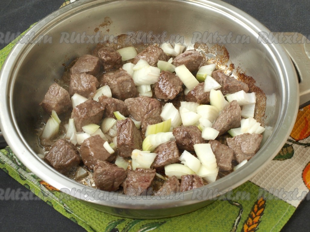 Разогреть в сковороде подсолнечное масло, выложить кусочки мяса и обжарить на среднем огне до румяной корочки со всех сторон. Затем выложить к мясу нарезанный кубиками очищенный лук и обжарить, помешивая, до прозрачности лука.