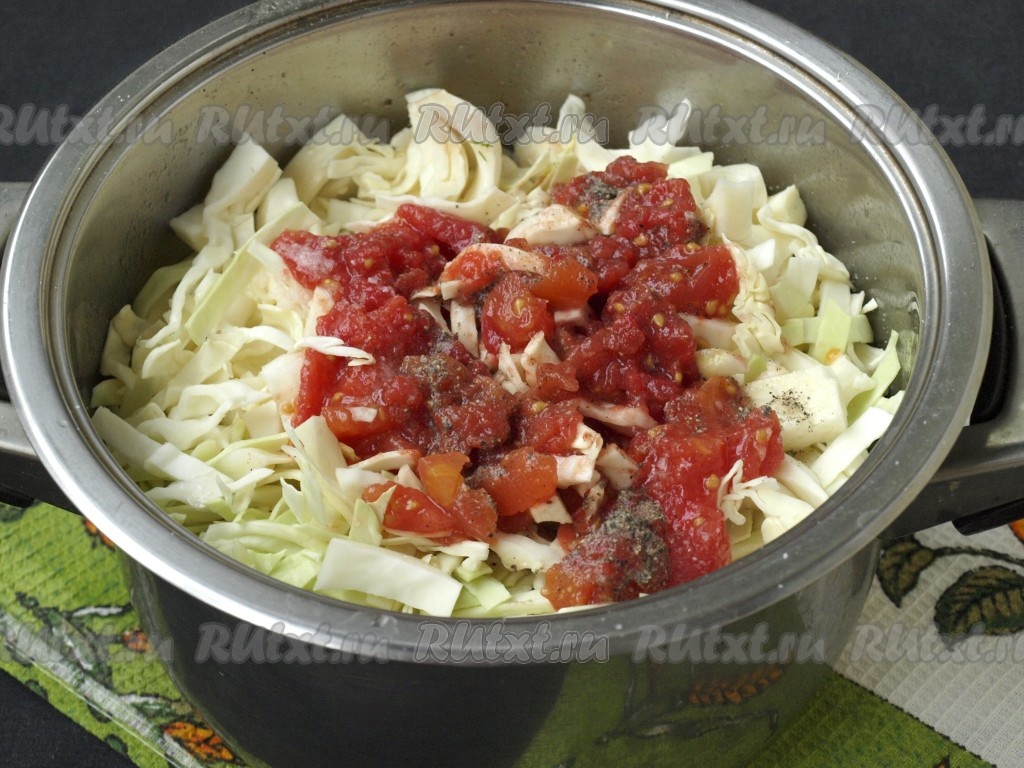 Нашинковать капусту и спустя время добавить её к картошке. Влить сверху томатный соус (у меня вместо соуса помидоры в собственном соку). Также добавить ещё соли и молотого перца, перемешать. Снова накрыть кастрюлю крышкой, убавить огонь и тушить капусту с мясом и картошкой 15-20 минут. Один раз открыть кастрюлю и перемешать содержимое.