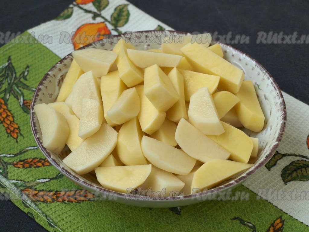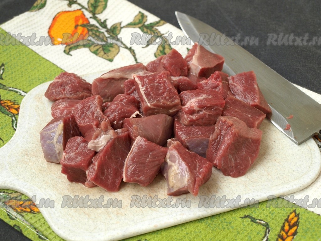 Мясо промыть и обсушить, нарезать средними кусочками.