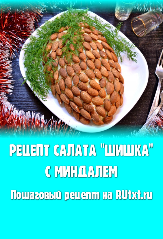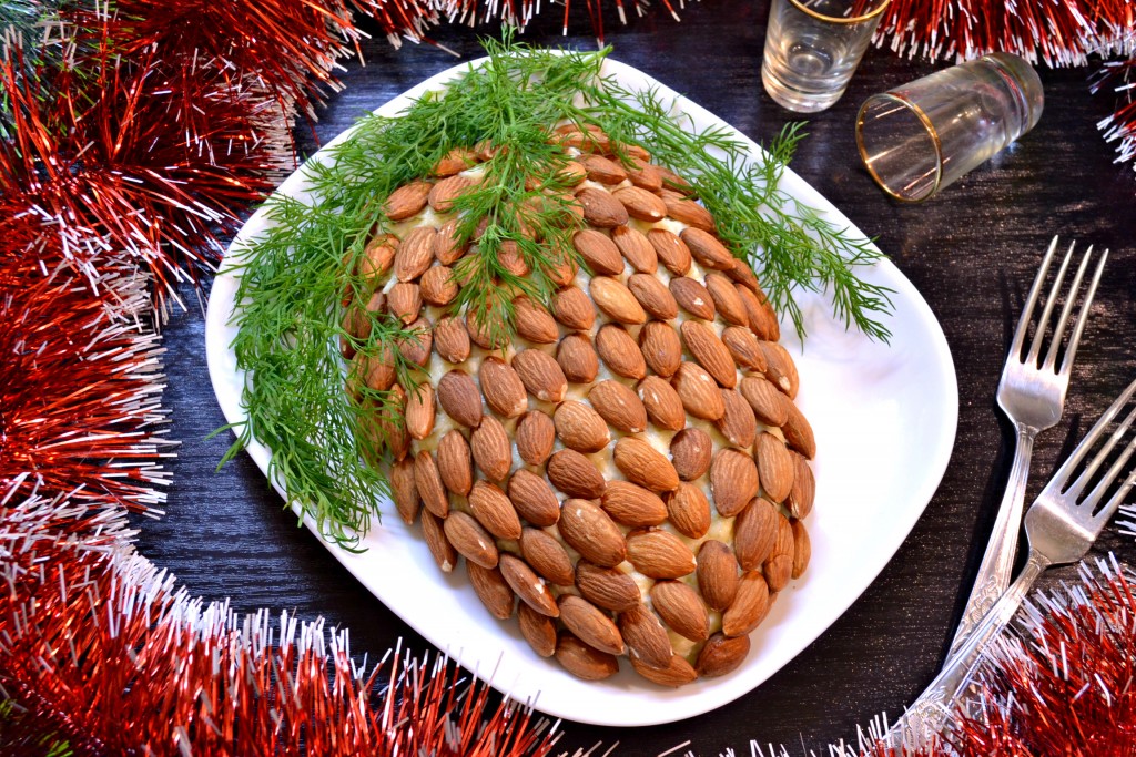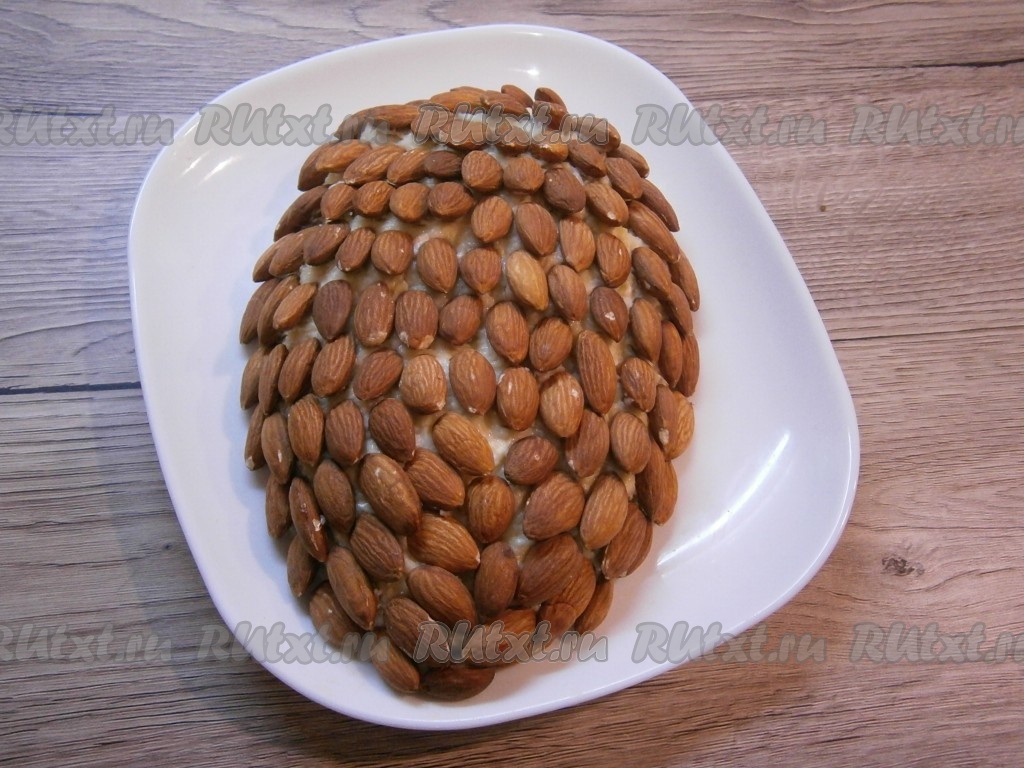 Красивый, вкусный и эффектный салат "Шишка", украшенный миндалем, подать к праздничному столу.