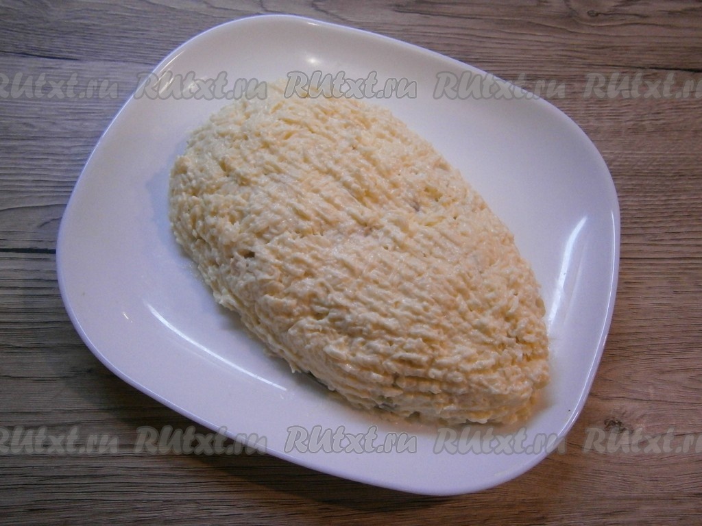 Добавить к сыру с майонезом пропущенный через пресс чеснок, перемешать. Покрыть сырной массой весь салат - и сверху, и с боков, выравнивая вилкой.