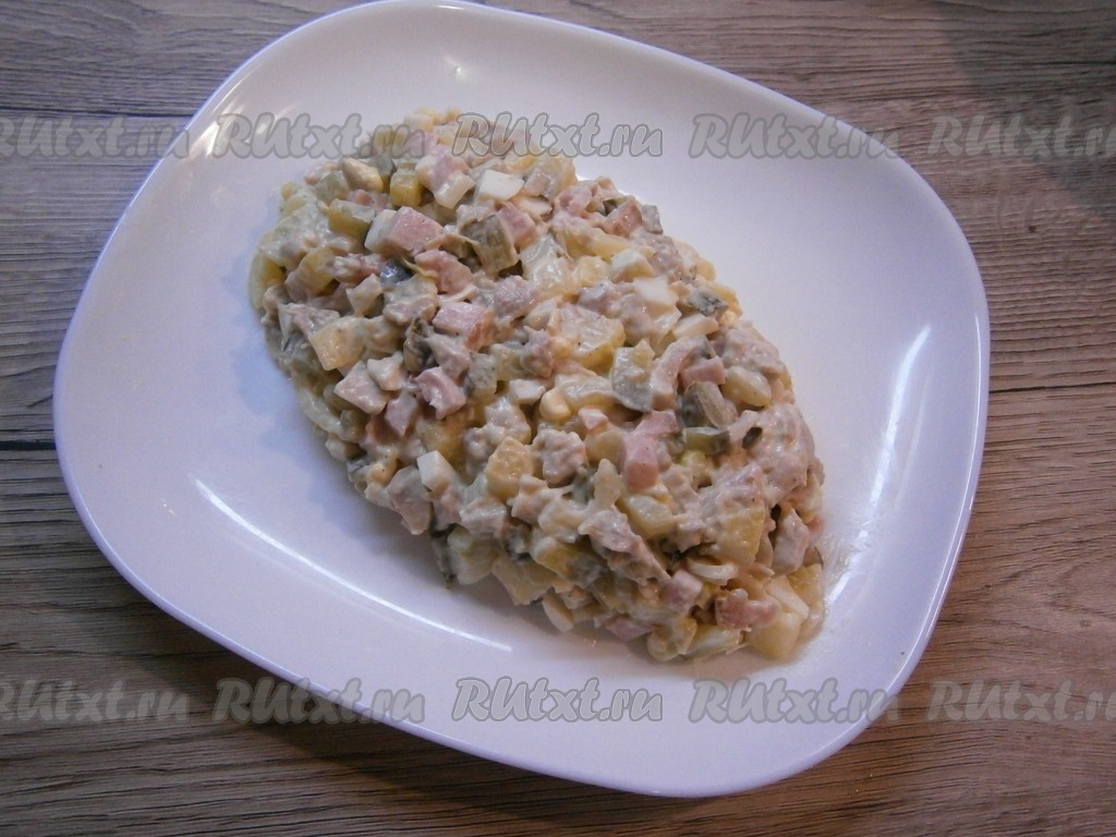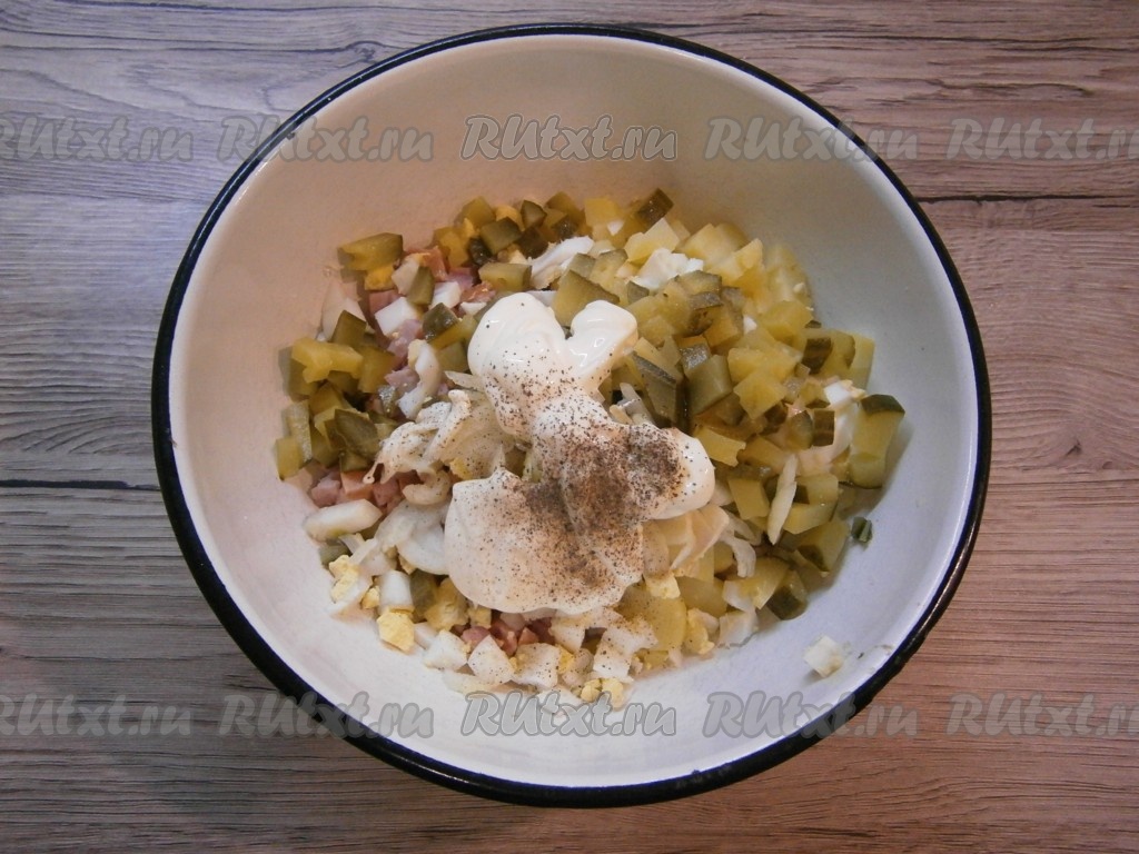 Сюда же добавить мелко нарезанный очищенный репчатый лук (если не любите - не кладите) и нарезанные кубиками маринованные огурчики, майонез, соль и перец по вкусу.
