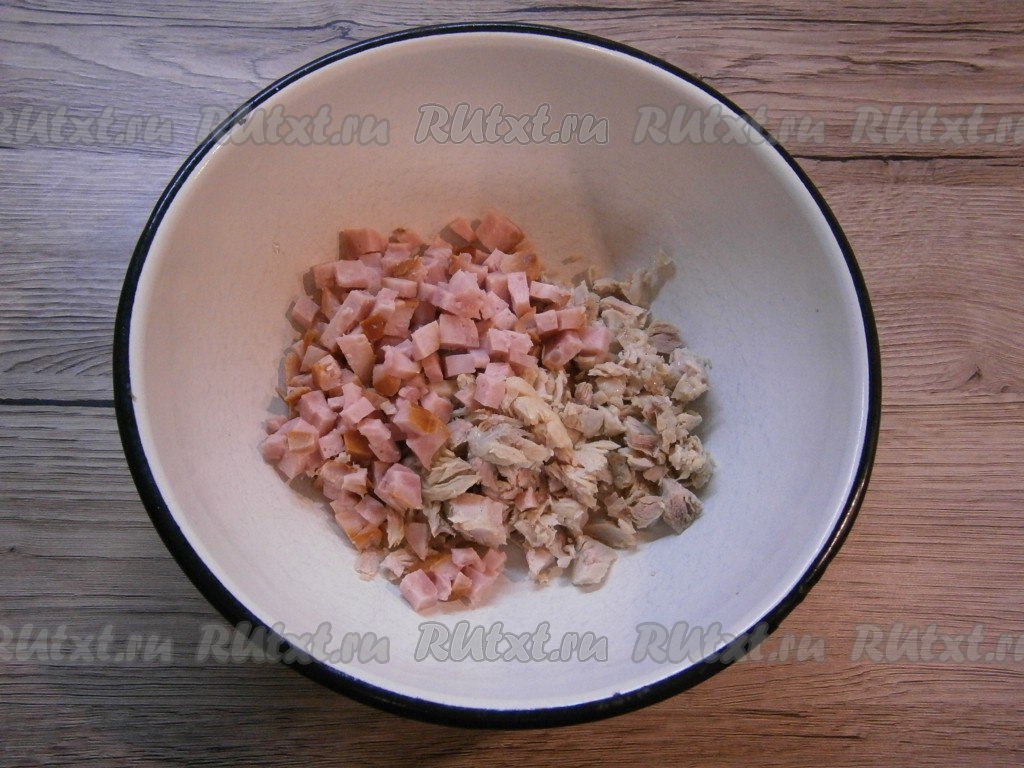 Отварное мясо курицы нарезать кусочками, добавить нарезанную мелкими кубиками ветчину.
