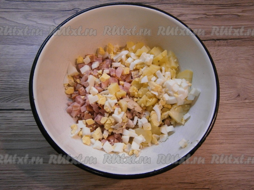 Добавить рубленные вареные яйца и нарезанный кубиками очищенный вареный картофель.