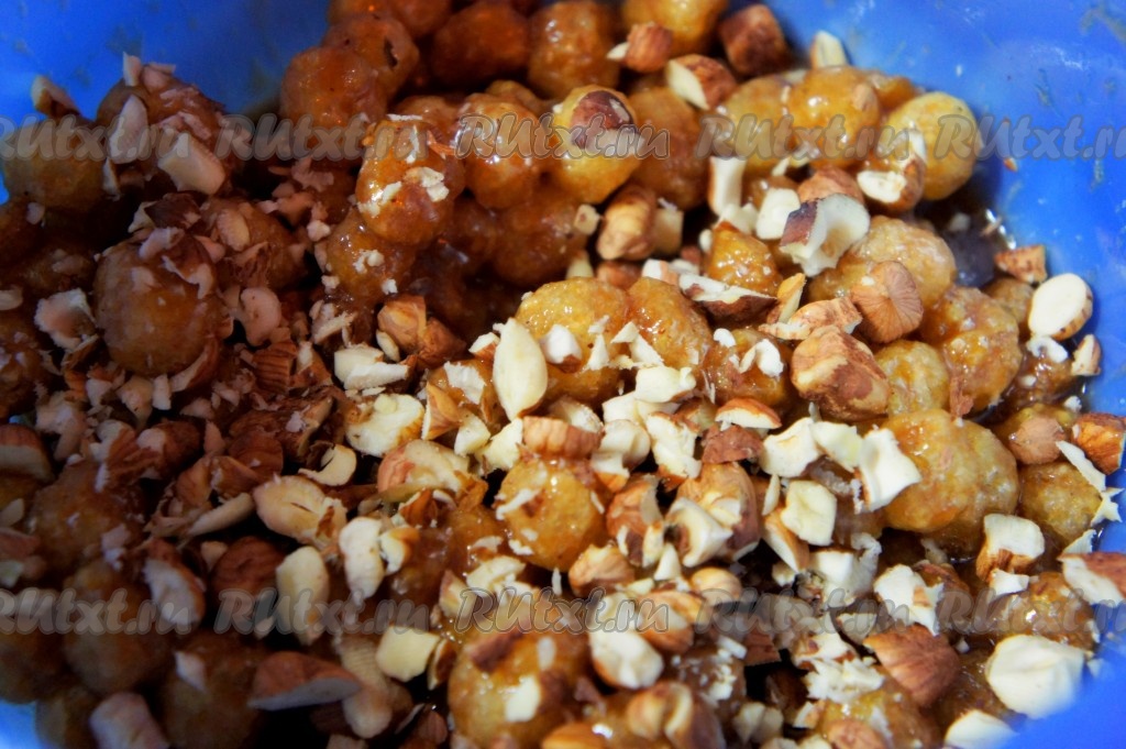 Полученную сливочно-карамельную массу снять с огня. Добавить какао, тщательно перемешать. Добавить кукурузные палочки, нарезанные орехи, перемешать.
