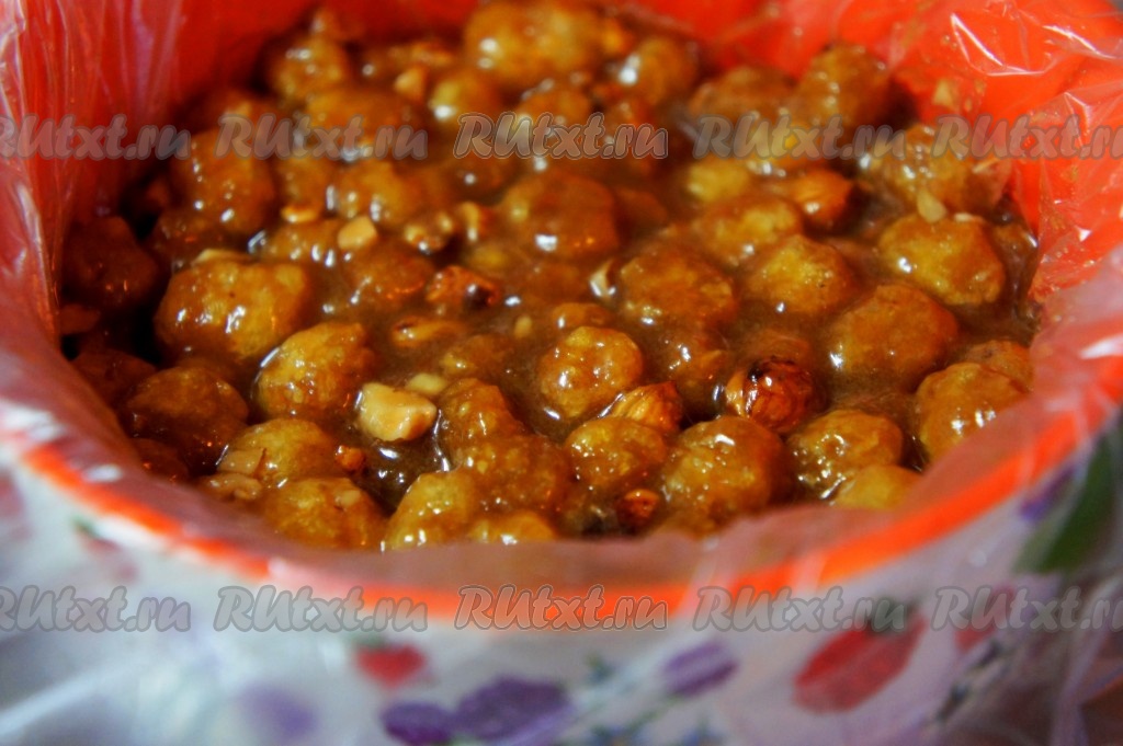 Миску или форму застелить пищевой плёнкой, выложить сливочно-шоколадную смесь с орехами и кукурузными палочками, хорошо "утрамбовать" ложкой. Убрать наш десерт в холодильник на 2 часа до полного застывания.