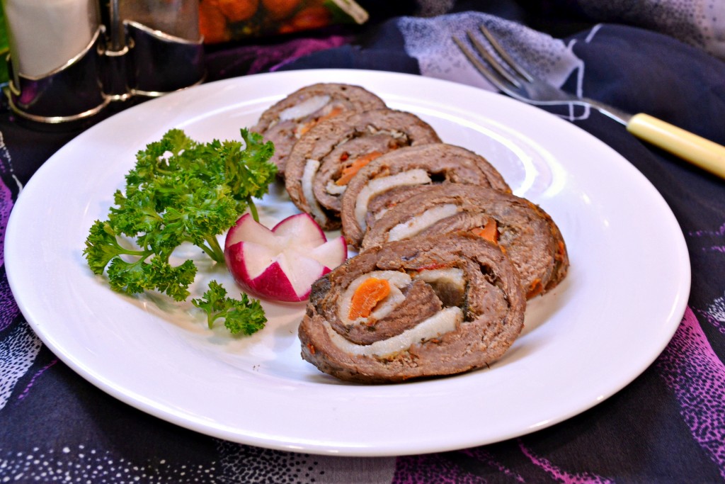 Поместить мясной рулет в любую подходящую форму для запекания и отправить в разогретую духовку. Запекать при температуре 180 градусов 1 час. Вкусный и ароматный рулет из говядины с начинкой, запеченный в духовке, готов! Если подавать в горячем виде, тогда нужно сразу же снять пергамент, рулет нарезать и подать к столу. Для подачи в качестве холодной закуски, говяжий рулет нужно остудить, отправить в холодильник прямо в пергаменте на 6-7 часов, после чего нарезать на кусочки, выложить на тарелку и подать к столу.