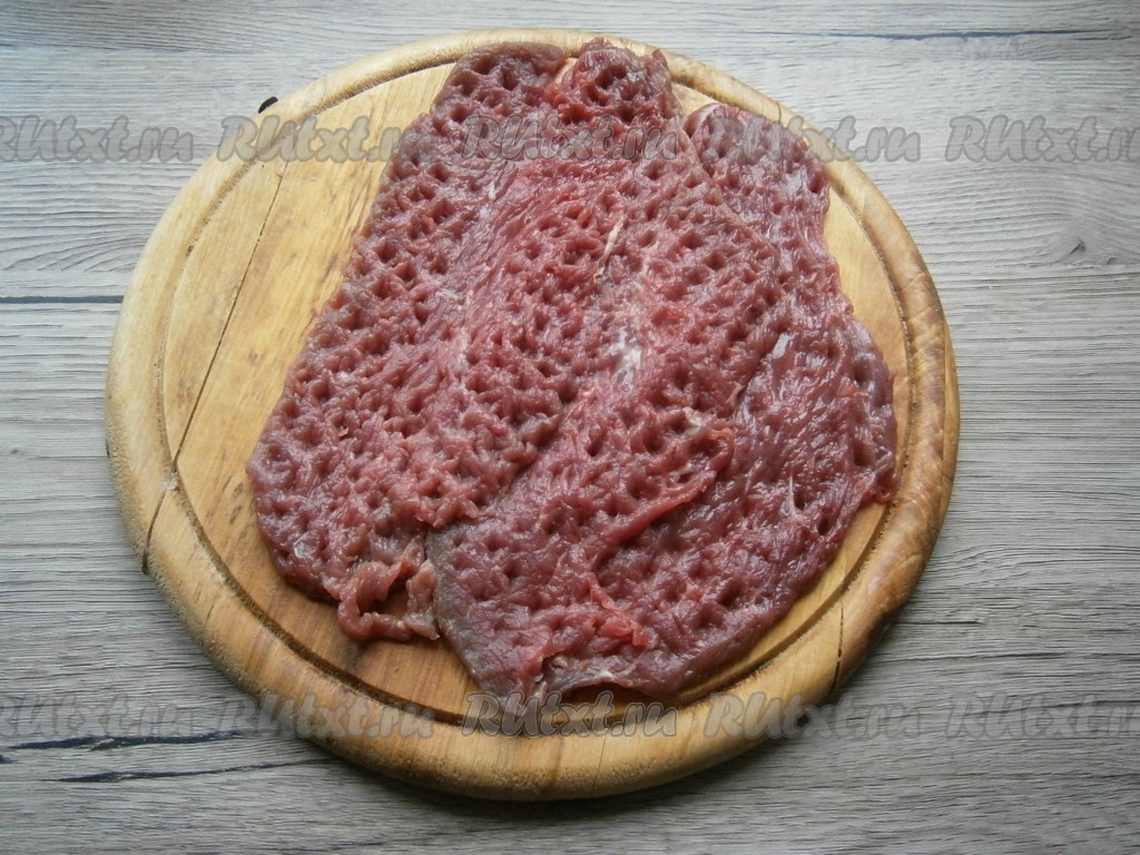 Морковь и чеснок очистить. Мясо разрезать на 3 тонкие части, как для отбивных. Отбить говядину молоточком.