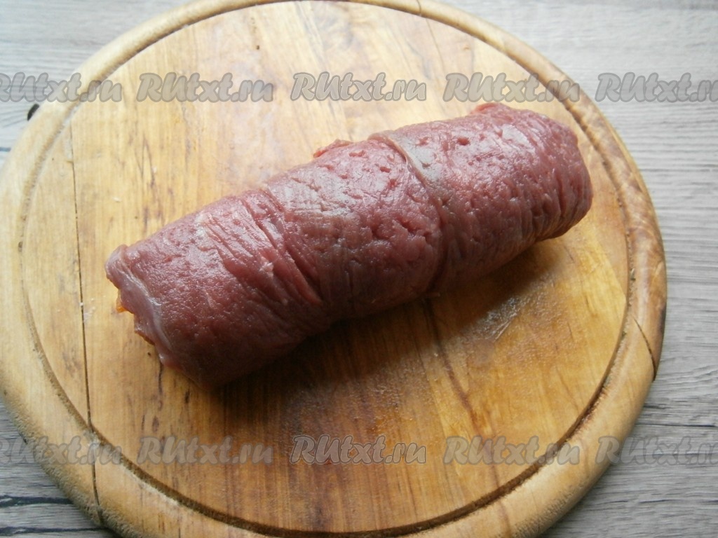 Также выложить сверху мяса тонкие ломтики свиного сала. На краю пласта говядины расположить 5-6 длинных, тонких брусочков сырой моркови.