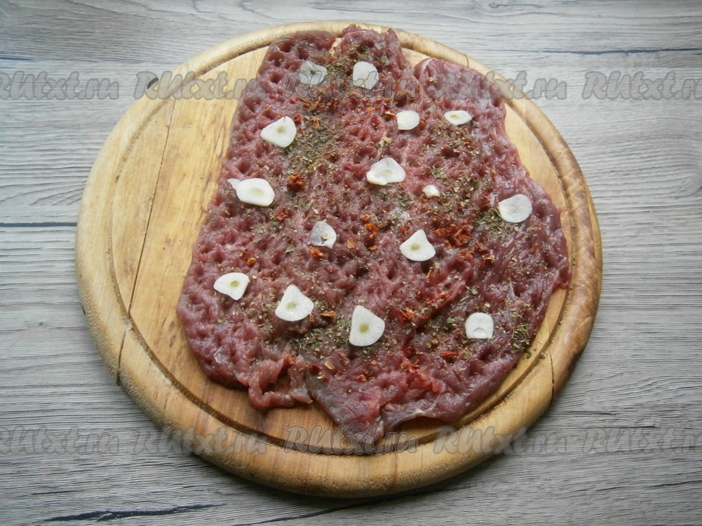 Сложить мясо внахлест, посыпать специями и солью, выложить тонкие ломтики чеснока.
