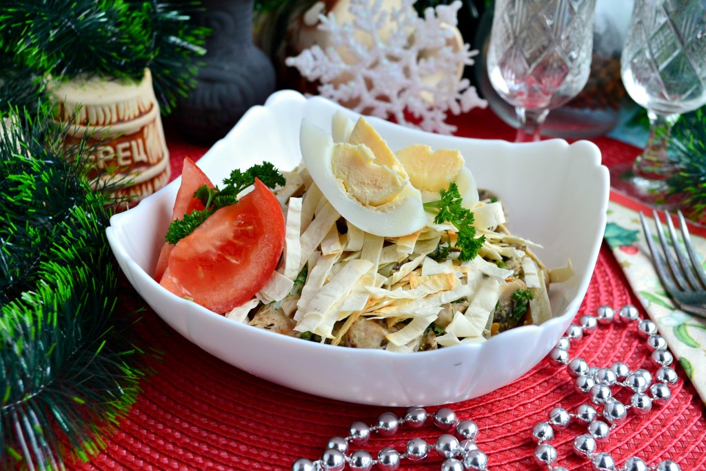 Предлагаю вам попробовать необычный салат с лавашом и курицей, приготовленный по рецепту одного грузинского повара. Блюдо получается очень интересным и вкусным. Перед подачей салат посыпается, а потом перемешивается с подсушенной хрустящей соломкой из лаваша, которая приятно похрустывает. Обязательно попробуйте, замечательный салатик!