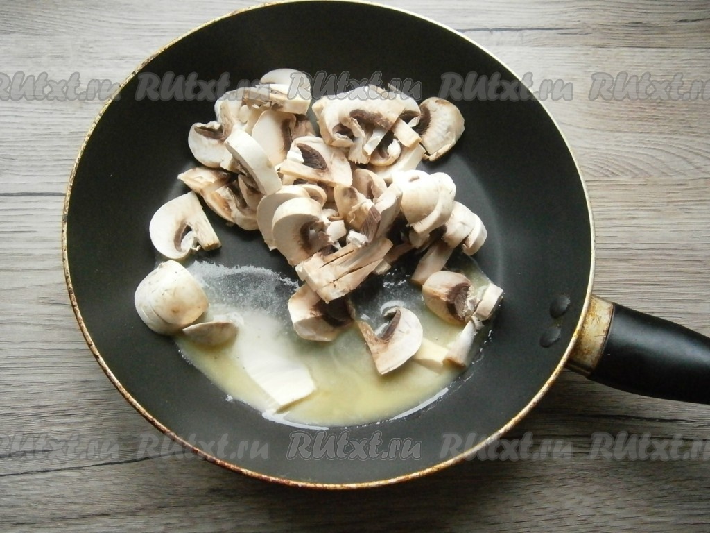 Шампиньоны нарезать пластинами, выложить в сковороду с растопленным сливочным маслом.