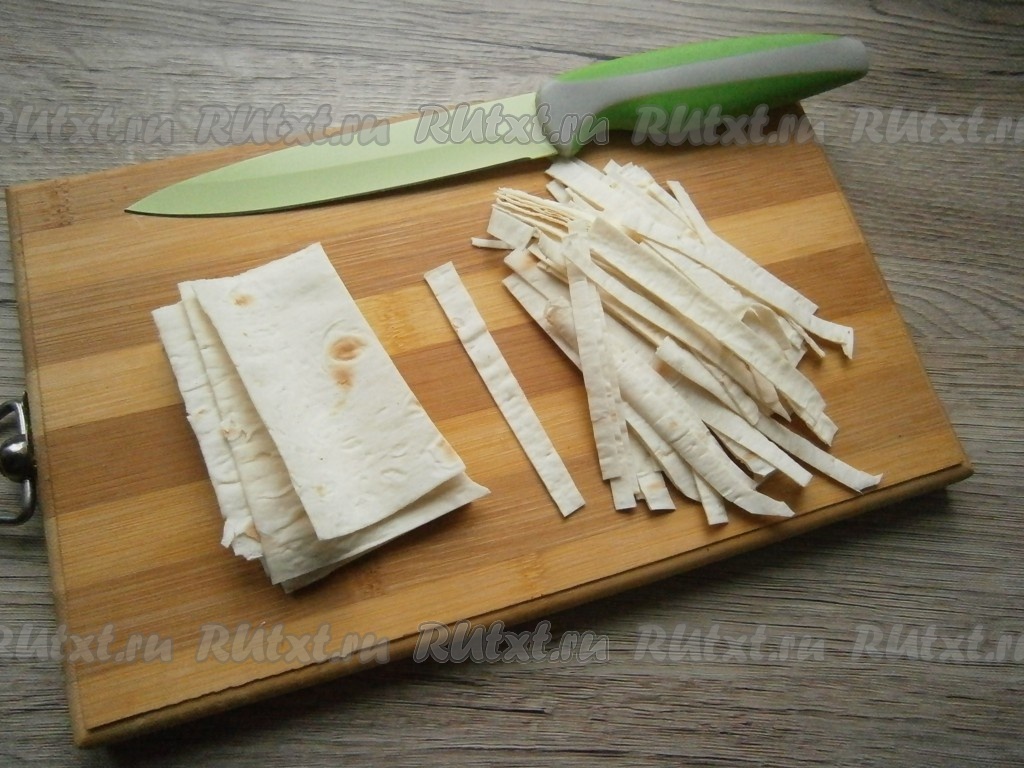 Посолить салат, если нужно, и перемешать. Лаваш нарезать на несколько частей, сложить их друг на друга и нарезать тонкой лапшой.