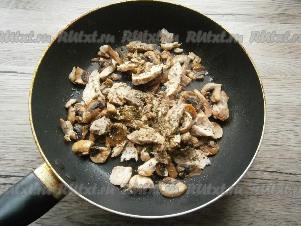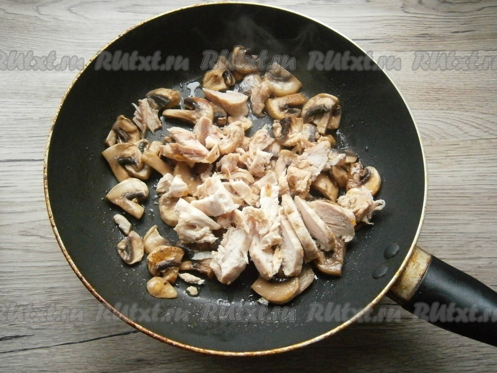 Грибы обжарить, помешивая, в течение 2-3 минут, затем добавить к ним нарезанное кусочками вареное куриное мясо.