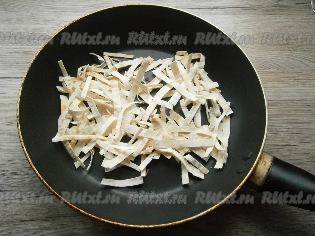 Лапшу из лаваша подсушить на сухой сковороде, помешивая, на небольшом огне до хрустящего состояния.