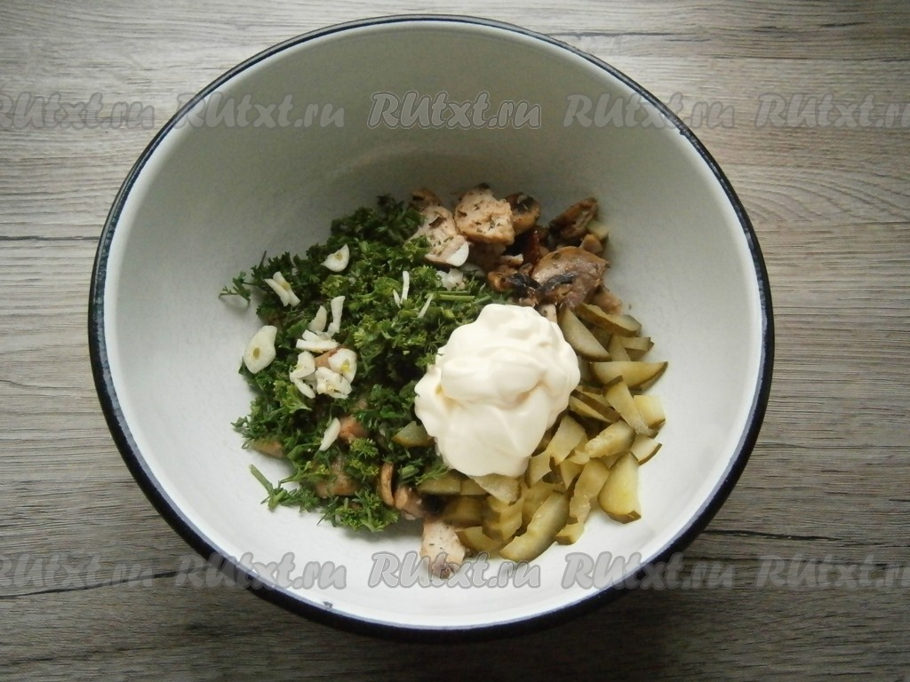 Сюда же добавить майонез, очищенный и нарезанный мелко чеснок.