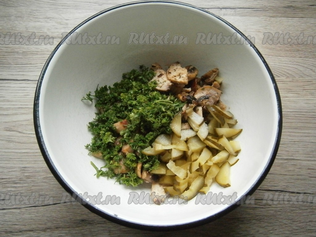 Содержимое сковороды выложить в миску, добавить нарезанный соломкой маринованный огурец и измельченную зелень петрушки.