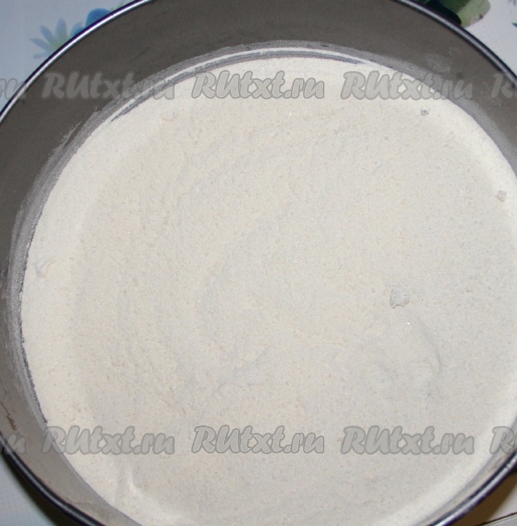 В глубокой миске соединяем муку, сахар, манку, разрыхлитель, тщательно перемешиваем сухие ингредиенты, делим их на две равные части. Разъёмную форму для выпечки диаметром 22-24 сантиметра смазываем растительным маслом, высыпаем одну часть сухих ингредиентов, разравниваем.