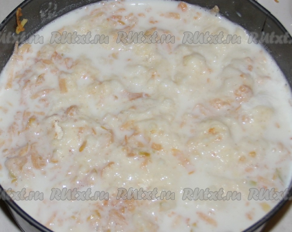 Яблоки очищаем от кожуры, натираем на крупной тёрке, стараясь не затрагивать семенную коробочку с косточками. Равномерно выкладываем яблоки поверх сухих ингредиентов.