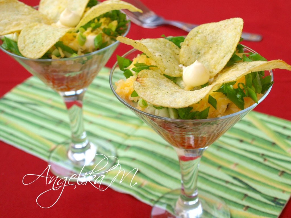 Хочу предложить вашему вниманию рецепт порционного праздничного салата "Орхидеи". Такой салат готовится из простых и доступных продуктов, но получается очень вкусным! Главная задача - купить вкусную колбасу. Чипсы также лучше выбирать в коробке, чтобы они сохранили форму. Часто покупая в пакете, большая часть чипсов уже непригодна для оформления.