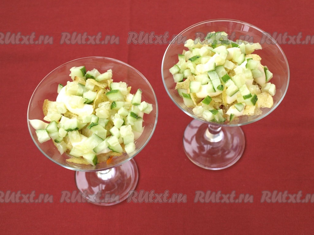 Сыр натереть на тёрке, мелко нарезать зелёный лук. Посыпать огурцы сыром и луком. Оставшиеся чипсы выложить в форме цветка орхидеи. Подать очень вкусный салат к столу.
