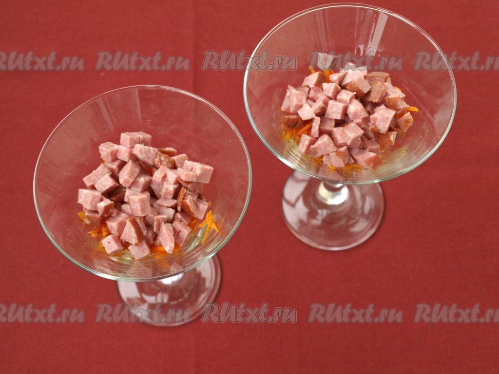 На дно креманок или бокалов выложить морковь по-корейски (если полоски моркови длинные, их можно разрезать на несколько частей). Копчёную колбасу нарезать кубиками и выложить сверху, нанести майонез.