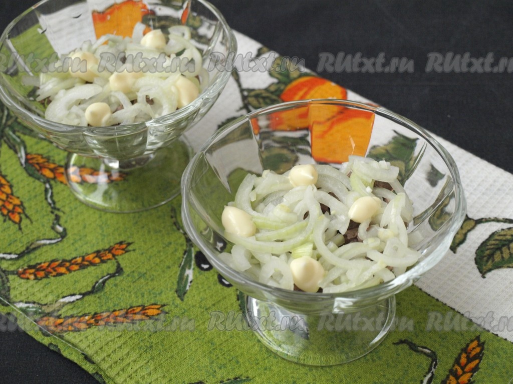 Филе курицы нарезать кубиками (вместо куриного филе можно также использовать филе индейки) и выложить на дно креманок. Сверху выложить маринованный лук и смазать майонезом.