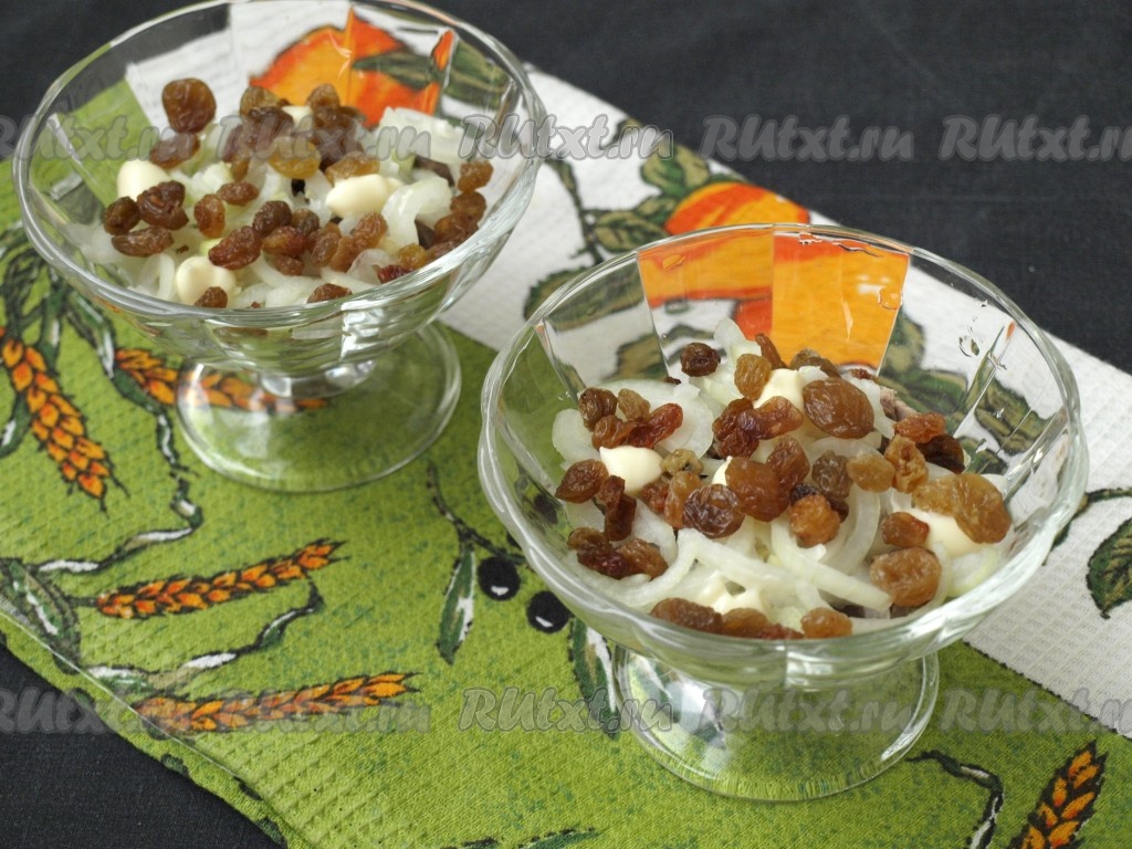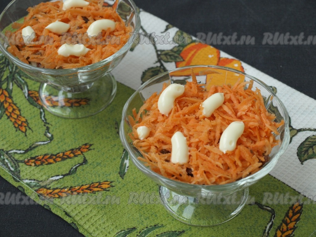 Сырую очищенную морковь натереть на тёрке и выложить поверх изюма. Нанести немного майонеза.