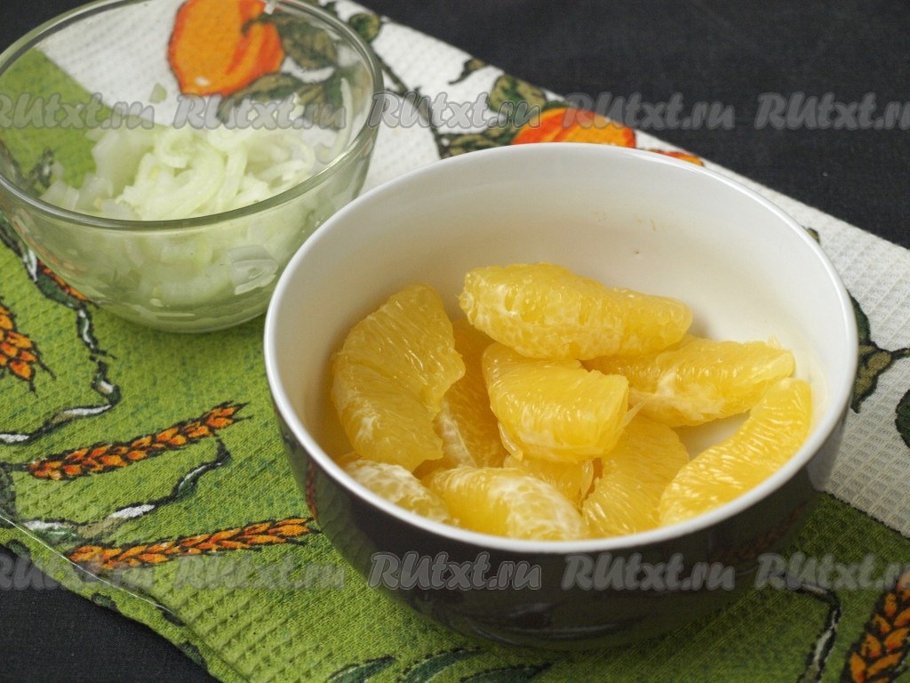 Куриное филе заранее отварить в течение 25-30 минут, охладить. В отдельной ёмкости замариновать лук, для этого к очищенному луку, нарезанному четверть кольцами, добавить сахар, соль, немного помять руками и влить уксус, оставить мариноваться, пока подготавливаются другие ингредиенты. Апельсин очистить от кожуры и плёнок.