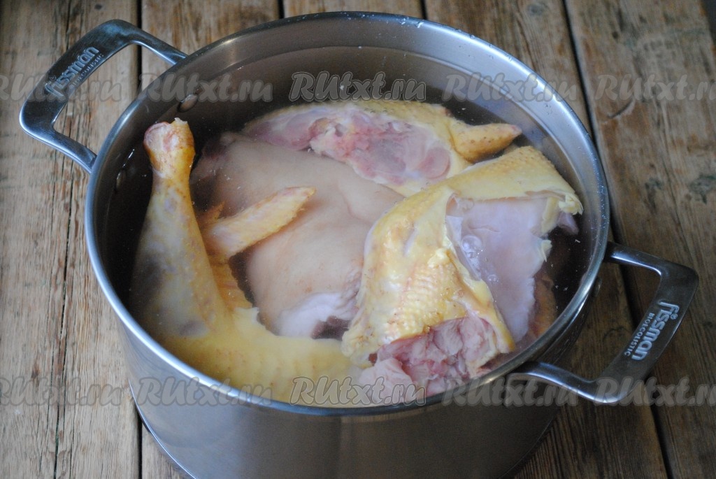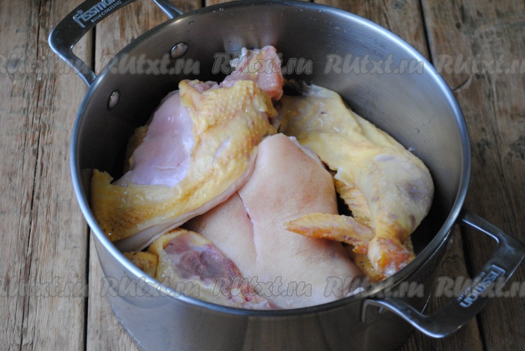 Курицу разделить на куски. Я готовила из домашнего петуха, но можно сварить и из покупной курицы, холодец в любом случае застынет и получится вкусным. Желирующее вещество содержится не в курином мясе, а в рульке. Куски курицы выложить в кастрюлю со свиной рулькой.