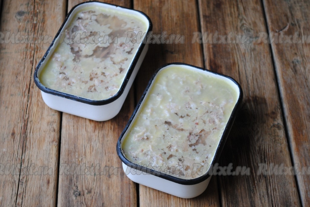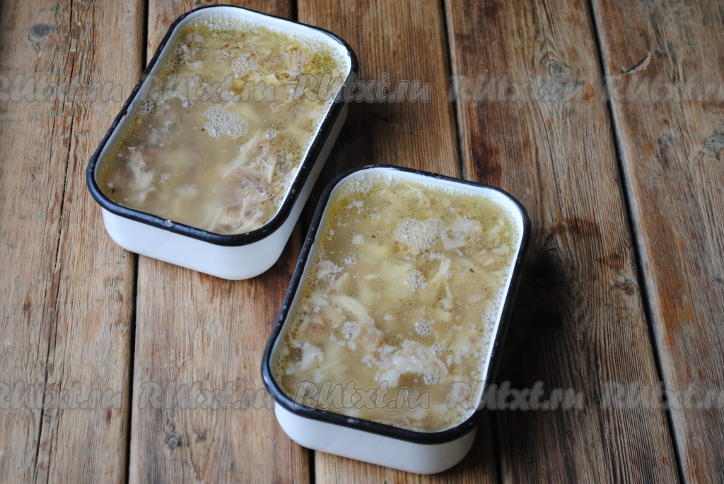 Мясо в формах залить горячим бульоном и оставить остывать при комнатной температуре.