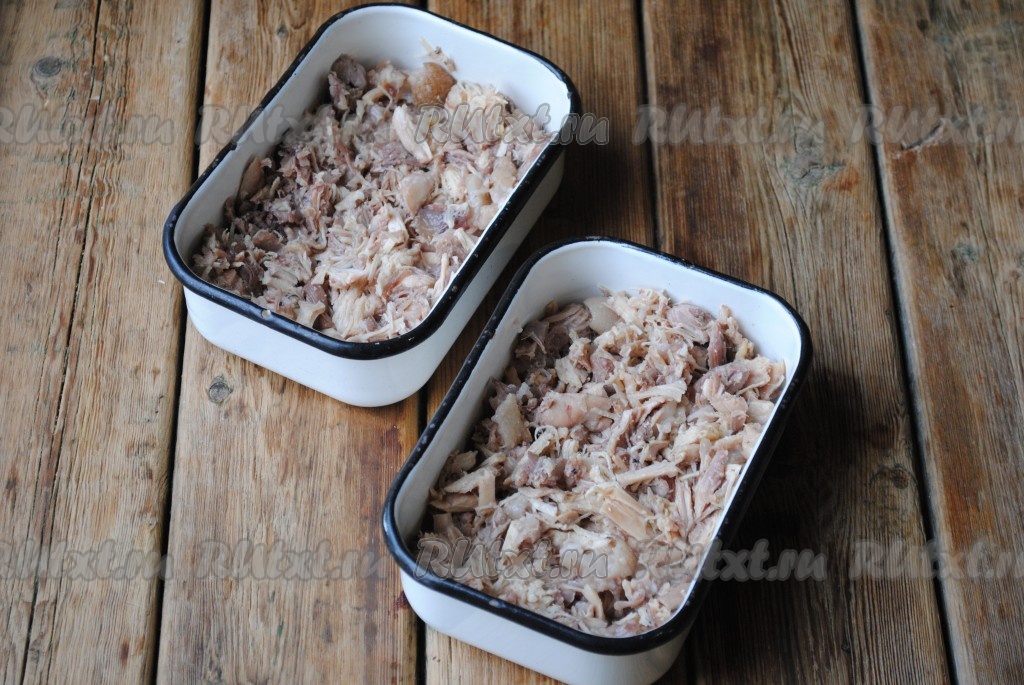 Куриное мясо, отделенное от костей, нарезать на небольшие кусочки или перекрутить через мясорубку. Из рульки убрать все кости, мясо вместе с кожицей также мелко нарезать ножом. Соединить нарезанное мясо.