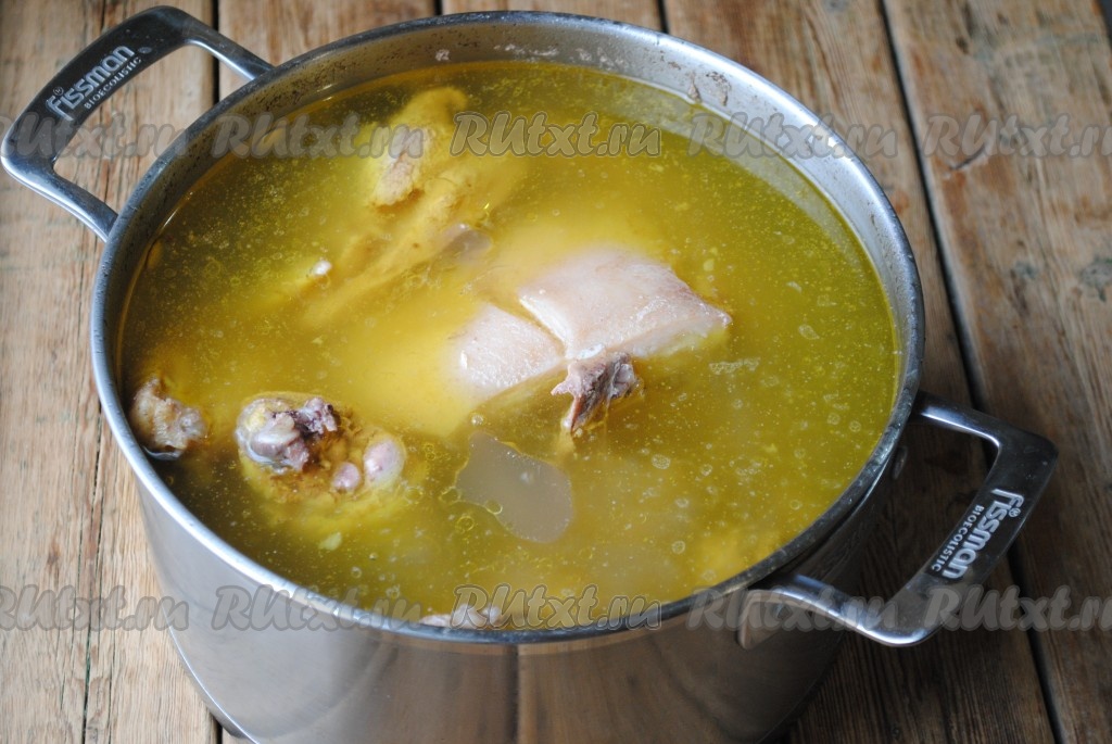 Свиную рульку и курицу хорошо вымыть под проточной водой. Рульку выложить в большую кастрюлю.