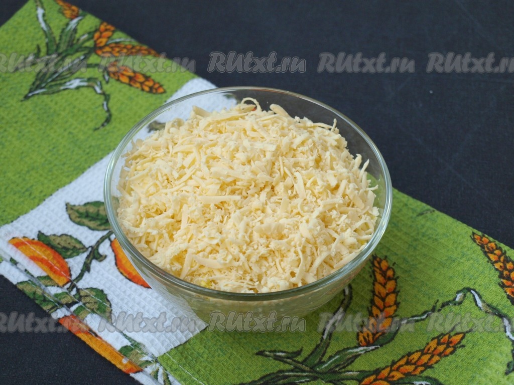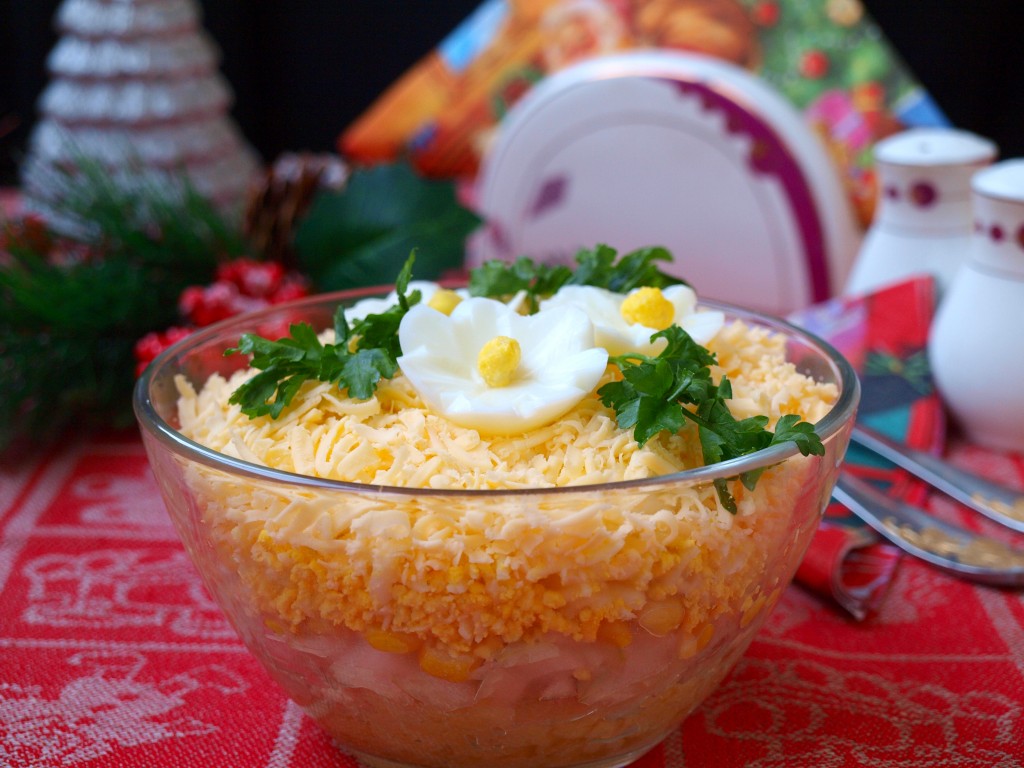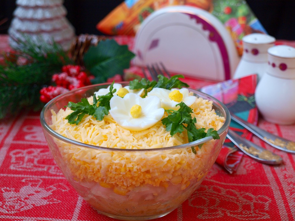 Затем очистить, натереть на тёрке яйца и выложить их поверх кукурузы, смазать майонезом.