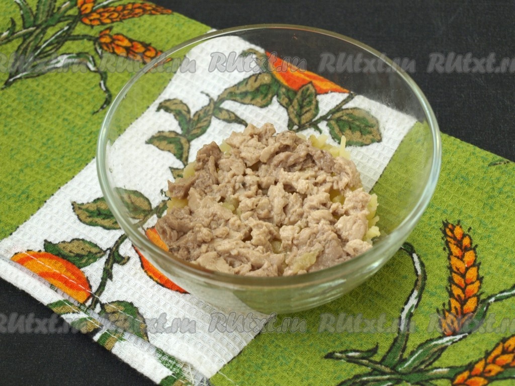 Очищенный варёный картофель натереть на тёрке и поместить на дно салатника. Печень трески, размяв вилкой, выложить поверх картофеля.