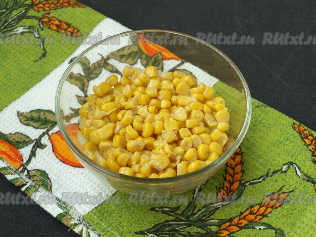 Далее выложить слой консервированной кукурузы. Обращаю внимание на то, что мы ни один из слоёв не смазывали майонезом. Печень трески пропитает картофель и он станет сочным, а лук и кукуруза - и без пропитки достаточно сочные ингредиенты.