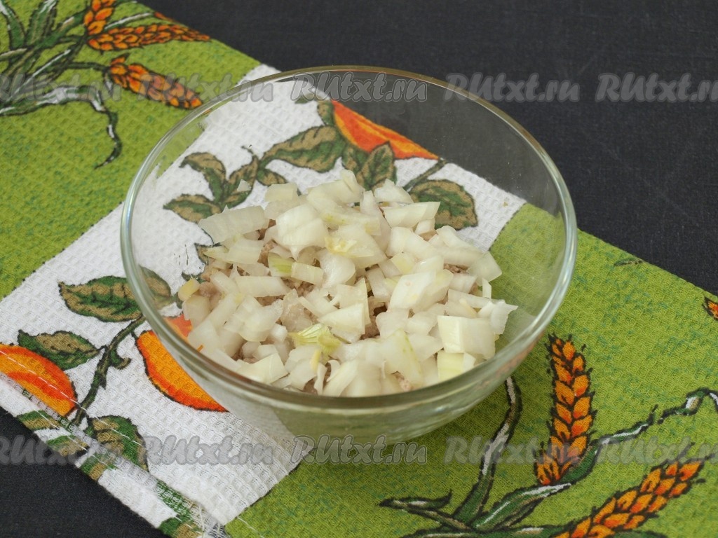 Кубиками нарезать очищенный репчатый лук, выложить его сверху печени.
