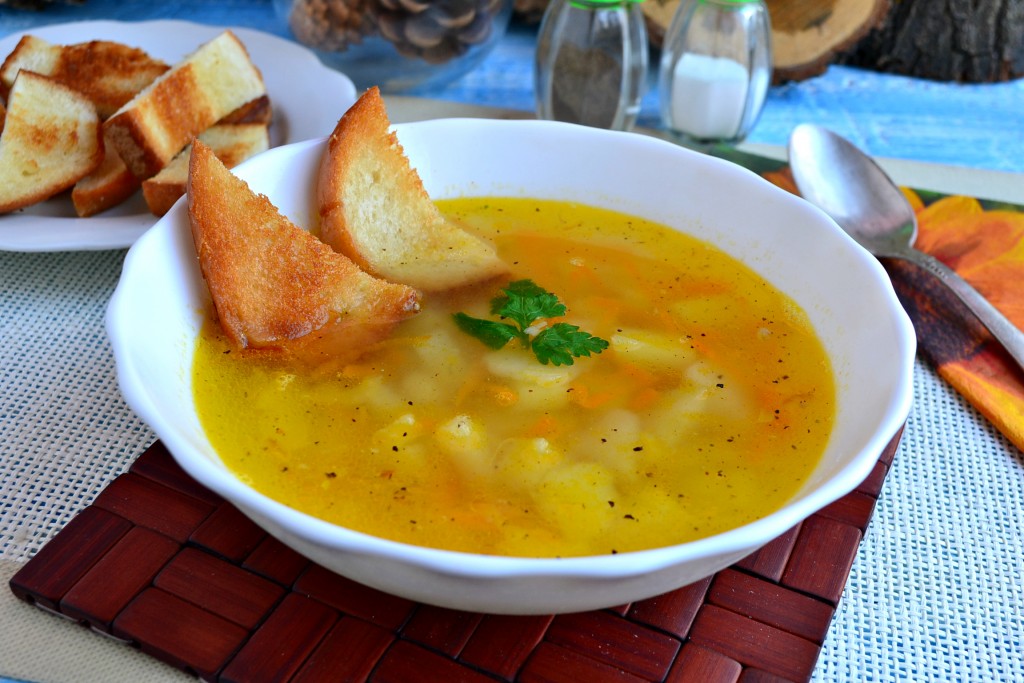 Предлагаю вам приготовить отличный картофельный суп с гренками. Супчик получается очень вкусным, легким, но достаточно сытным. Я сварила этот суп на основе куриного бульона, поэтому он получился ещё и ароматным. Гренки я готовила из белого батона, по желанию, можете батон заменить на серый или ржаной хлеб.