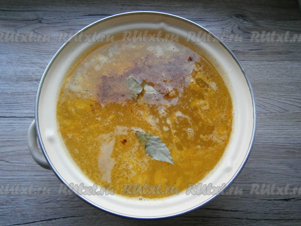 Размятый картофель вернуть в кастрюлю и добавить обжаренные овощи. Всыпать в суп специи, добавить лавровые листья и измельченный чеснок.