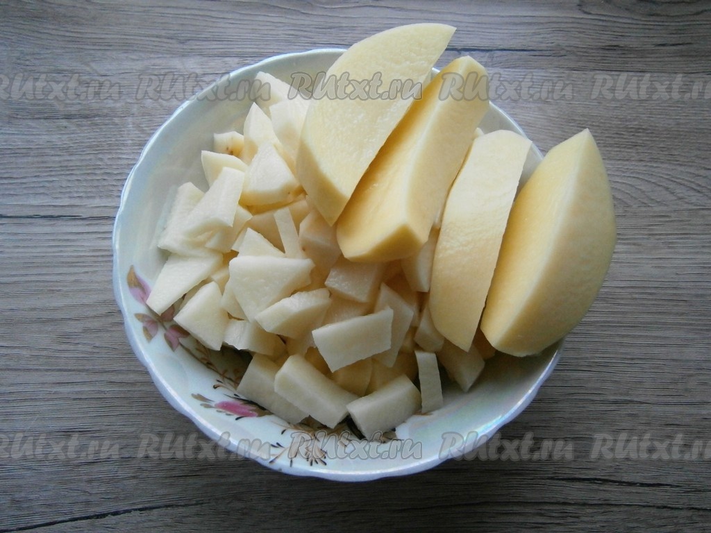 Картофель, морковь, чеснок и лук очистить, вымыть. Одну картофелину разрезать вдоль на 4 части, остальную картошку нарезать небольшими кусочками.