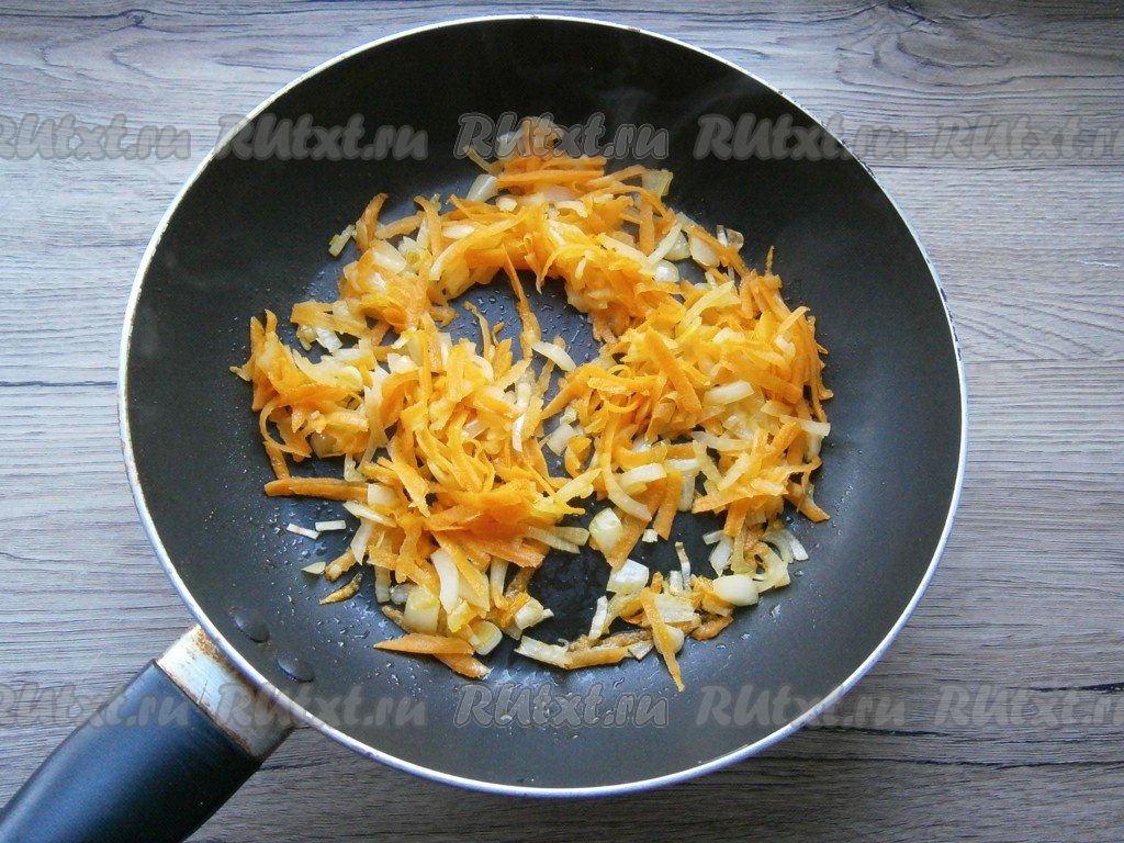 Добавив на сковороду пару ложек растительного масла, выложить морковку с луком и обжарить, помешивая, до мягкости.